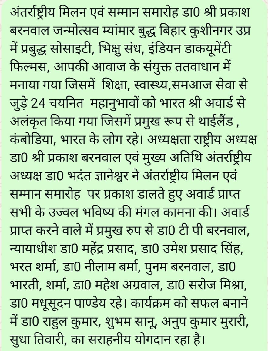 आवश्यक सूचना भारत श्री फाउंडेशन , प्रबुद्ध सोसाइटी एवं इंडियन डाकयूमेंटी फिल्मस शिक्षा स्वास्थ्य, समाज सेवा, फिल्मस उधोग, संस्कृति, राजनीति, उधोगपति, एजेंसी प्रमुख, संत , अनुसंधान कर्ता से भारत श्री अवार्ड चयन हेतु बायोडाटा, फोटो 30.10.25 तक भेजने की कृपा करें। इमेल bharatshriaward1@gmail.com Indian documentary film@gmail.com prabudh society@gmail.com